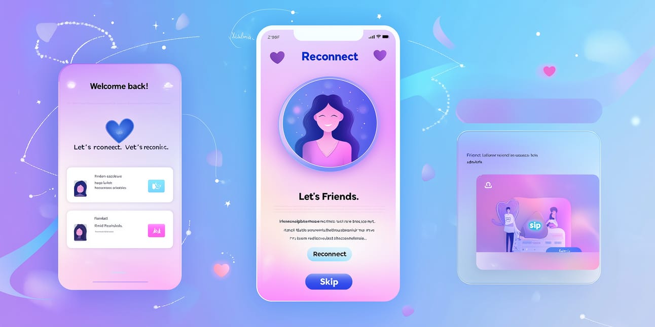 Design a serene and nostalgic UI for a "Reconnect" app. The home dashboard features a gradient background transitioning from lavender to sky blue. A sleek, transparent navigation bar at the top has a minimalistic heart and friendship bracelet logo. In the center, display a large circular profile picture of the user, surrounded by softly glowing, animated particles. Below it, a cursive welcome message reads: "Welcome back! Let's reconnect." Include a rounded search bar with the placeholder "Find Friends." Beneath the search bar, showcase a card carousel with "Friend" each card displaying a profile picture, name, and shared history snippet, with "Reconnect" and "Skip" buttons at the bottom. The footer has minimalist icons for Home, Search, Messages, and Profile, with a gentle glow when selected. Add small, animated shooting stars in the background for a whimsical touch. —ar 2:1 —v 6.1 —q 2